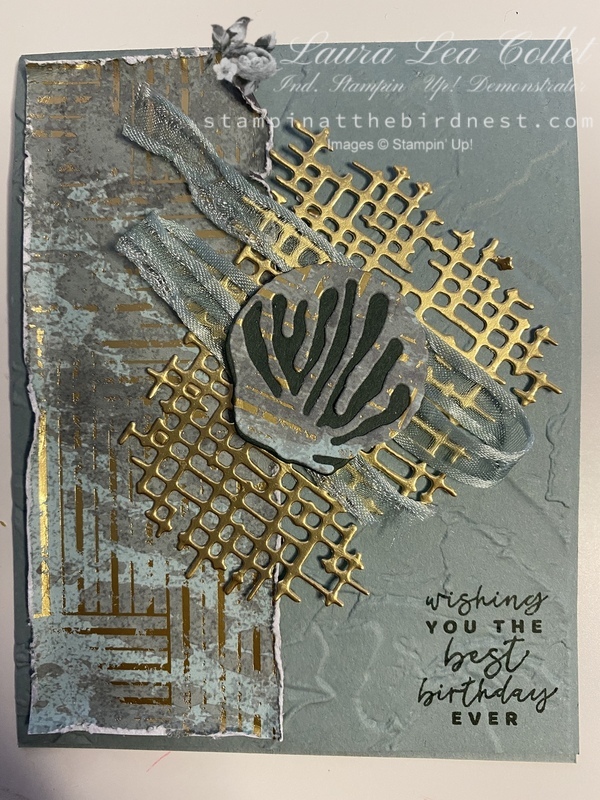 Use dies to cut solid shell in Evening Evergreen and cut out shell in DSP. Cut "net" in foil. Use Die Brush to clean chads.