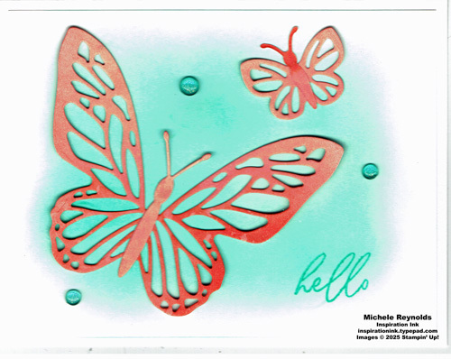 Use Multipurpose Liquid Glue on the backs of the butterfly body cut outs along the centers to adhere them to the front of the card as shown so they are centered over the butterfly cut outs.