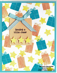Use the mini spatula on the Take Your Pick to carefully peel up 1 large and 2 small Summer Splash dots from a sheet of Sunny Day Iridescent Dots making sure that you get the adhesive backings as well. Adhere them to the front of the card as shown.