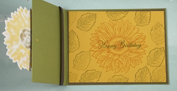 On flap using dimensionals and making sure that it exactly covers stamped image on inside of card, adhere colored sunflower.