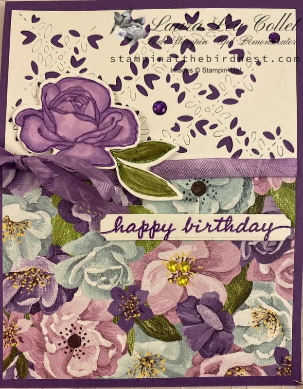 Stamp flower and leaves in black. Color as shown. Use dies to cut out. Use decorative die to cut white. Place as far to the top as able.
