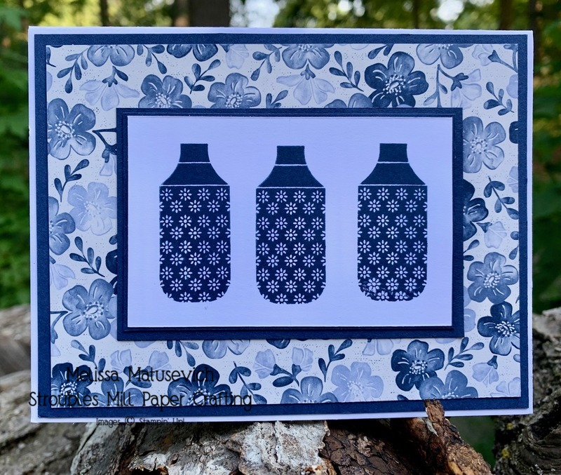 On a piece of white cardstock cut at 3 1/2" x 2 1/4" stamp the three vases in Night of Navy ink.