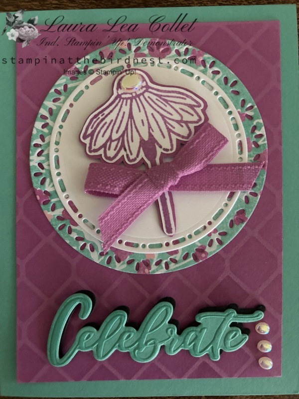 Use circles to cut white & DSP. Stamp flower and fussy cut. Adhere to card front. Use dimensionals for flower.