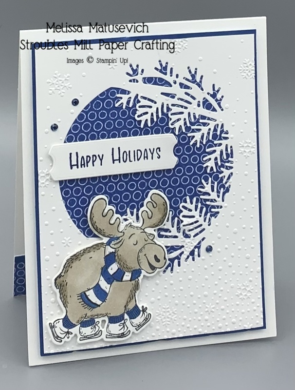 T he combination of Basic White and Blueberry Bushel make this card pop. The adorable moose is lumbering along enjoying life.