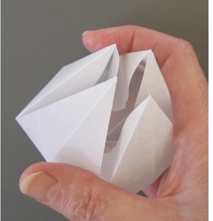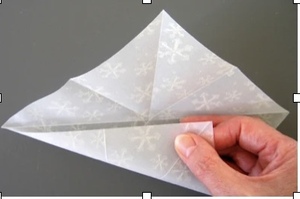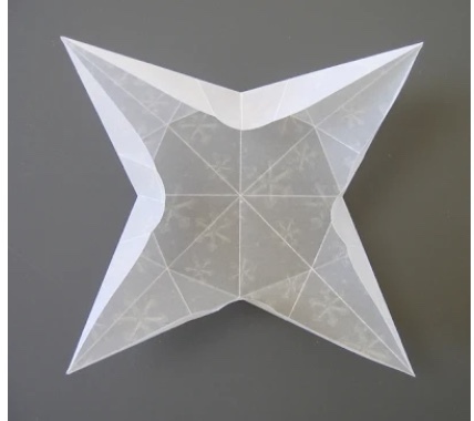 After all four corners have been folded, open the square and press the space between each airplane fold... the square will begin to look like this
