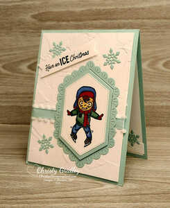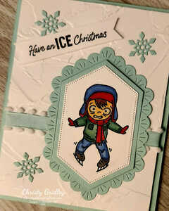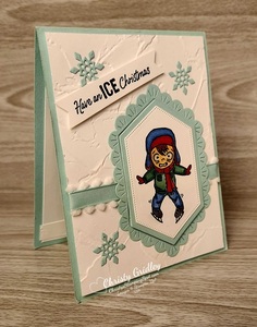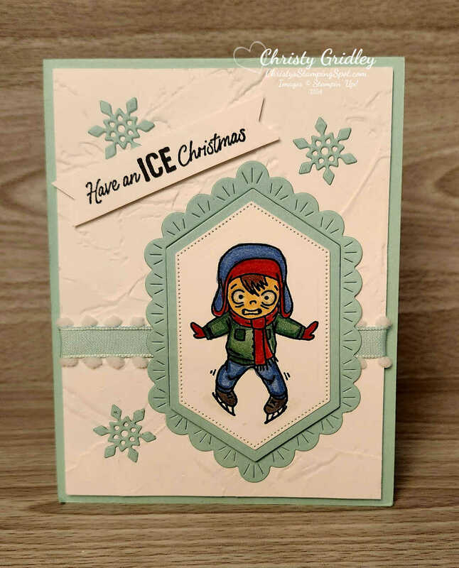 Die cut a Pool Party cardstock scalloped frame & label and a Basic White stitched label with the Wildflower Designs dies. Stamp the ice skating little boy image from the Dear Santa stamp set in Memento Black ink on the die cut stitched Basic White label. Color the little boy image with Stampin' Blends and add Wink of Stella for sparkle. Use glue to add the Pool Party cardstock scalloped frame to the right side of the card front overlapping the wrapped ribbon. Glue the stamped stitched label to the Pool Party cardstock label layer and then add the built label into the center of the scalloped frame with Stampin' Dimensionals.