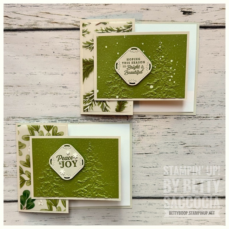Stamp greeting (using Old Olive ink) on Basic Beige tag (Peaceful Season dies) and adhere using dimensionals to front of card as shown.