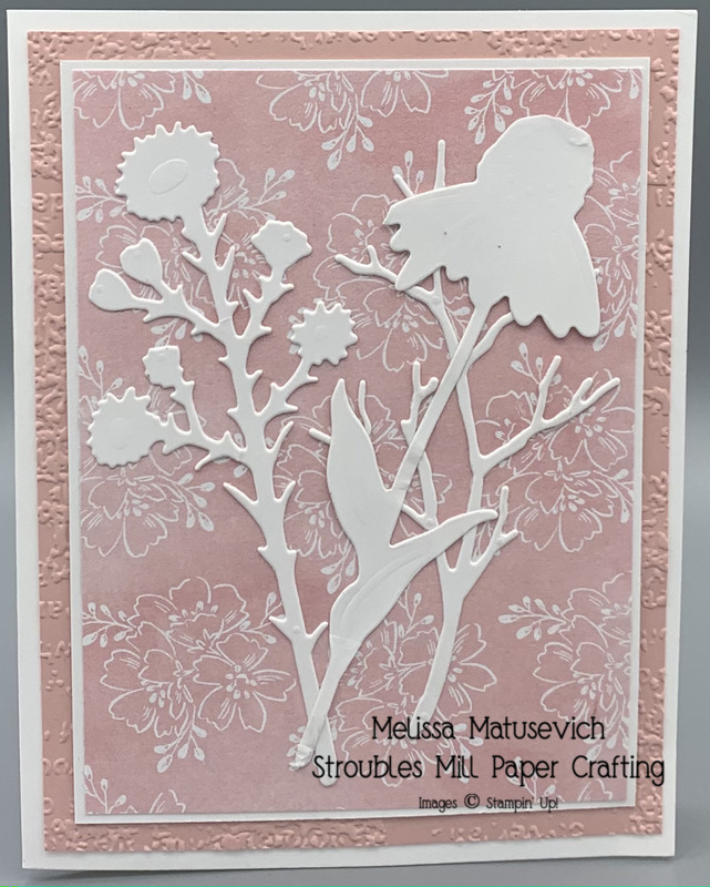To the front add Blushing Bride cardstock cut at 4" x 5 1/2" and embossed with the Timeworn Type folder.