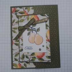 Stamp 3 jars on DSP With Old Olive stamp pad and punch out. Arrange on the Lemon Lolly Diecut as shown. I placed the 3rd jar on dimensionals. Add the bow with mini Glue Dots.