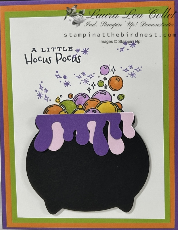 Stamp bubbles high enough to place pot. Color as desired. Add sentiment.