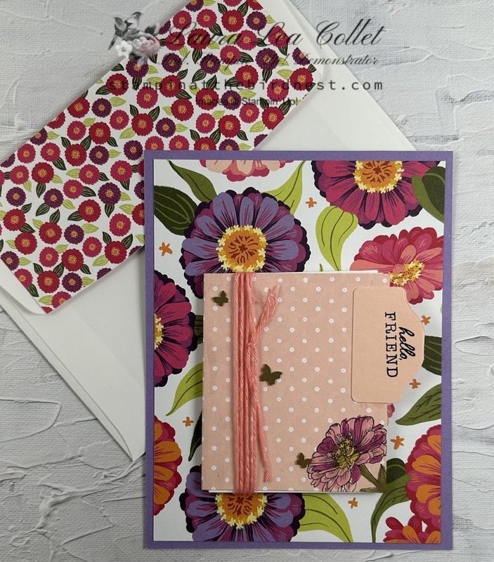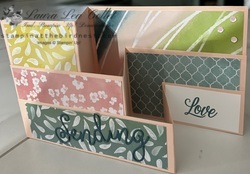 Stamp sentiment on Petal Pink scrap and punch out with tab punch. Adhere to side of DSP.