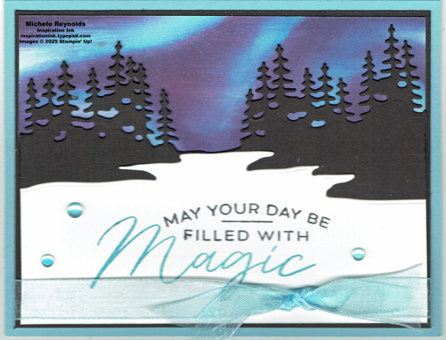 Adhere the group of trees cut out to the horizontal Lights Of Aurora Designer Paper rectangle so the tops of the trees are near the top of the designer paper and the gap between the trees is near the center of the rectangle. Use scissors to cut off excess cardstock on the right and left edges as needed.