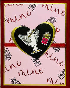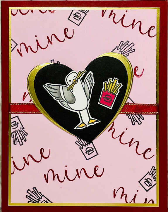 On White scarp stamp seagull and fries in Memento Black ink, color using Stampin' Blends Markers, fussy cut. Adhere to Hearts. Pop up heart on card front over ribbon.