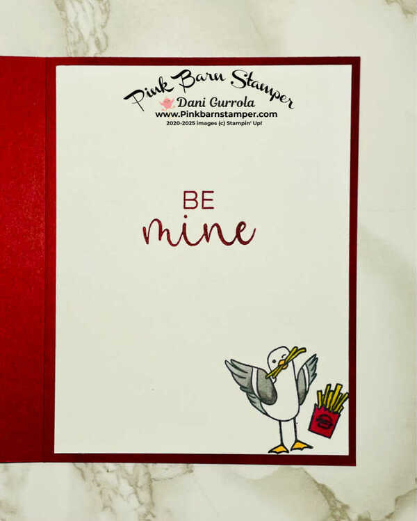 Inside- stamp sentiment in Cherry Cobbler ink. Stamp seagull and fries in Memento Black ink, color with Stampin' Blends Markers. Adhere layer inside card base.