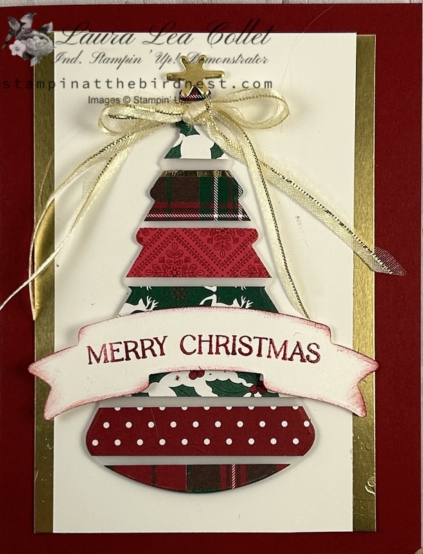 Place vellum over outline of tree and stick strips of paper alternating patters about 1/16" apart. Use die to cut out tree and foil star.