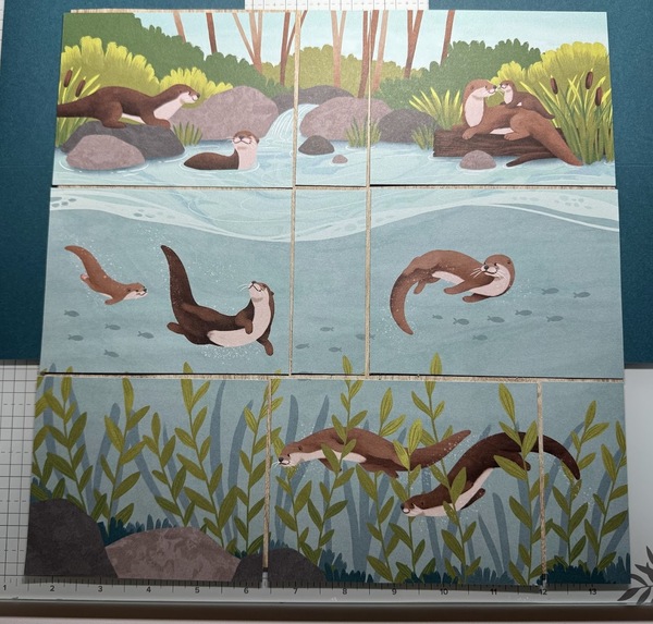 Cut the paper into 4" strips going across so you don't lose any of the otters. Then cut each strip apart one by one. For the top two strips, cut into two 5-1/4" x 4" pieces and one 1-1/2" x 4" piece. For the bottom strip, cut the swimming otters to get a piece that is 5-1/2" x 4". I had to cut off a bit of the otter's tail on the right. The other bigger piece will end up about 4-7/8" x 4". Save the smaller pieces, we will use them!