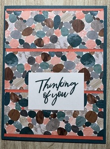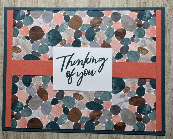 To use up the last three pieces of DSP, I cut another piece of Calypso Coral at 4" x 5-1/4" and mounted it on a Pretty Peacock base. Then, I turned over the DSP to the "rock" side and arranged them on the cardstock. It's nice to use glue, so you have some time to wiggle the paper a bit to get it where you want it.