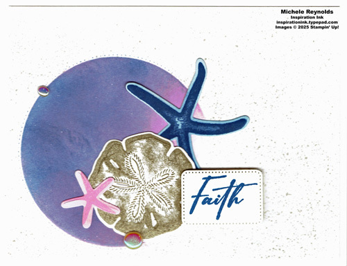 WITHOUT ADHERING, lay the sand dollar and sea star cut outs on the front of the card as shown along the lower right side of the blended circle to figure out placement and spacing. When happy with the arrangement, adhere the pieces in place using Stampin' Seal and Multipurpose Liquid Glue.