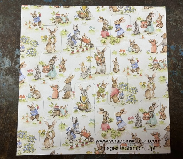 Use the second smallest rectangle with rounded corners to trace around the rabbits you want to die cut from the Storybook Moments Designer Series Paper. Die cut the rabbit pieces.