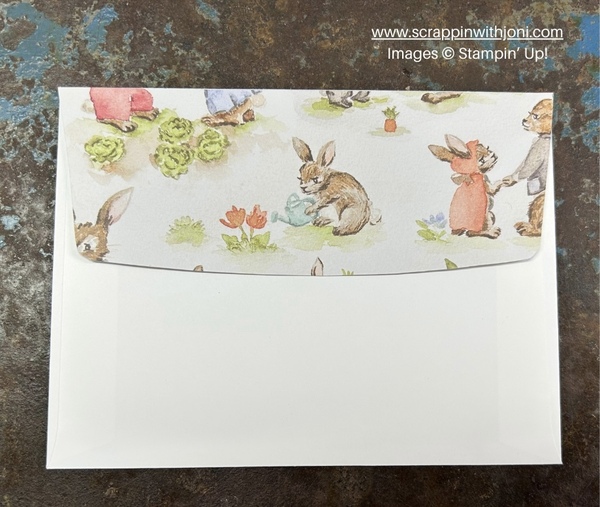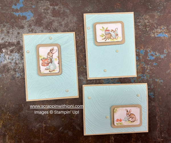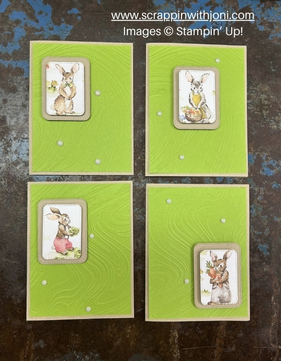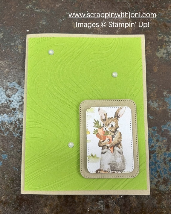 Attach two Stampin’ Dimensionals to the back of the die cut print paper to attach to the die cut Crumb Cake mat. Place a Stampin’ Dimensional in each corner to the back of the Crumb Cake mat. Attach the matted bunny to the card front.