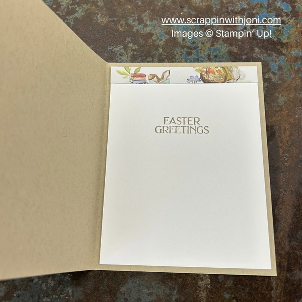 Card Insert: For the inside of your card, cut a piece of Basic White 4 X 5 ¼. Cut a piece of print paper used on the front of your card ½ X 4. Attach to the top of the card insert. Stamp a sentiment from Storybook Friends stamp set with Crumb Cake ink before attaching this piece inside your card.