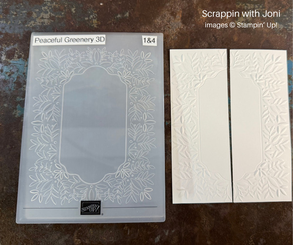 Card Mat: Cut TWO pieces of Basic White paper 4 X 5 ¼. Emboss one of the white pieces with the Peaceful Greenery embossing folder. Cut the embossed piece the center vertically so you have two pieces that measure 2 X 5 ¼. You only need one for this card, save the other one for your next card.