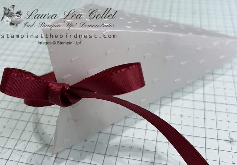 Punch hole on each side and thread ribbon through. Tie a bow.